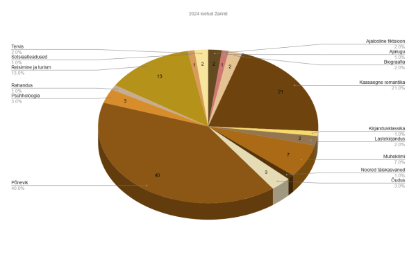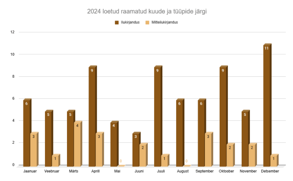 Sajast raamatust 73 olid ilukirjanduse ja 27 mitteilukirjanduse teosed. Minu üheks eesmärgiks 2024. aastal oli lugeda vähemalt 1 mitteilukirjanduslik teos kuus, ehk aasta lõpuks kokku vähemalt 12. Päris igal kuul ma tegelikult ühte ei lugenud, aga oli kuid, kus sattus kätte ilukirjandusega peaaegu sama palju mitteilukirjandust. Naljakas, et päris 50:50 ühelgi kuul ei olnud. Äkki peaks selle 2025. aasta eesmärgiks võtma või midagi..