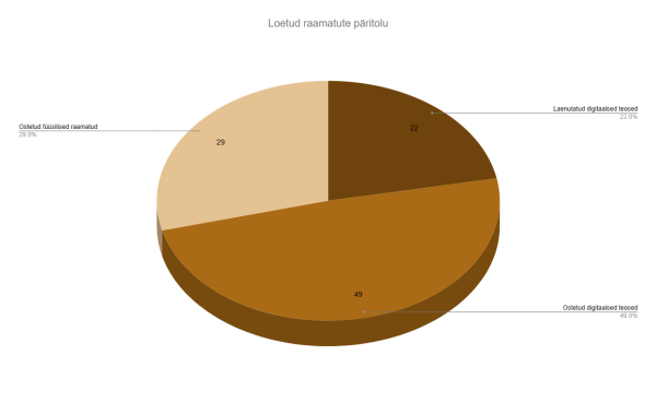 Loetud raamatute päritolu vaadates on hästi näha, kuhu mul palju raha kulus ja tegelikult on mul mõnda raamatut ka mitmes formaadis, mis selle graafiku peal tegelikult väga hästi ei kajastu. Päris mitu füüsilist koopiat ostsin alles pärast seda kui olin digitaalsel kujul ära lugenud.
