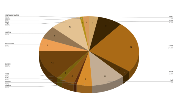 Kõige populaarsem kaane värv oli jälle sinine, selliseid oli kokku 21, punane oli 14-ga populaarsuselt teine ning kolmas hall 11 raamatukaanega. Oli ka beeže, musti, pruune, rohelisi, helelillasid, violetseid, oranže, roosasid, türkiissiniseid, valgeid ja kollaseid ning isegi 2 sellist, mida ei saanud kirjeldada muudmoodi kui vikerkaarevärvilised.