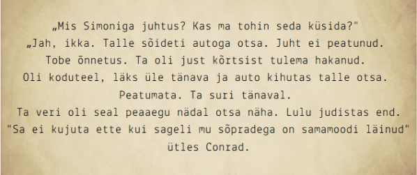 Kõige vähem meeldinud karakter oli minu jaoks Lulu raamatust Kass, kes tabas tapja. Ühtlasi oli see ka üks kahest raamatust, mis sai kõige madama hinde. Naljakal kombel pärineb sellest raamatust siiski minu lemmiktsitaat. Olgu öeldud, et Conrad on selles raamatus rääkiv kass.