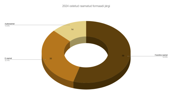 Ostetud 109-st teosest oli füüsilisi raamatuid 60, E-raamatuid 35 ja Audioraamatuid 14. Nendest loetud on mul 63, mis on kõvasti üle poole. Kui vaadata formaatide kaupa, siis e-raamatutest sain loetud 32 ja sellele aitas kõvasti kaasa see, et neid ma üldiselt “riiulisse” seisma ei osta ja teen ostu siis kui ma reaalselt kohe lugema hakkan. Erandiks on praegu 3 viimast Neitsijõe sarja raamatut, mis sai ette ostetud kuna mitme kaupa tuli ost soodsam ja teadsin, et loen selle sarja lõpuni. Audioraamatutest sai kuulatud 12, aga füüsiliste raamatutega ei ole nii libedalt läinud ja neid sain läbi vaid 19. Nii et 2024 ostetud, aga lugemata raamatute saldo oli aasta lõpuks 46.