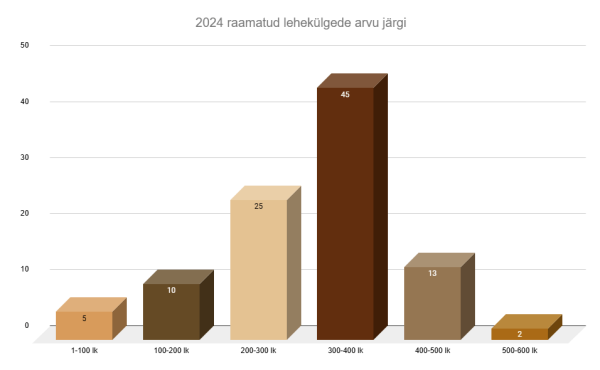 Lehekülgede mõttes oli kõige rohkem loetud raamatuid 300-400 leheküljelisi, selliseid oli lausa 45. Kõige pikem raamat oli Cormoran Strike’i sarja kolmas raamat “Kus on kurja kodu” 526 leheküljega ja kõige lühem kõigest 27 leheküljeline novella “Murder at the Royal Ruby” Nita Prose sulest. Alla 100 leheküljelisi oli tegelikult lausa 5 ning üle 500-leheküljelisi lugesin ainult 2.