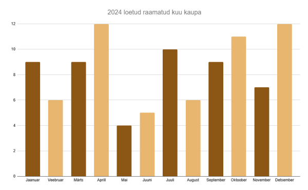 Kui 100 raamatut 12 kuuga jagada, siis keskmiselt võiks see olla 8 raamatut kuus. Nii tasakaalukalt ma ikkagi ei lugenud. Kõige rohkem raamatuid lõpetasin aprillis ja detsembris (12). Kümme või enam raamatut lugesin ka oktoobris (11) ja juulis (10). Veebruar (6) oli niikuinii lühem ja kuu alguses olin veel ka haige, nii et isegi audioraamatuid ei jaksanud eriti kuulata. Mai (4), juuni (5) ja august (6) olid ka pisut kesisemad, aga see ongi minu puhul tavaline, et suvel lihtsalt ei saa raamatud nii palju tähelepanu, sest on muid tegevusi nagu reisimine ja erinevad sotsiaalsed interaktsioonid.