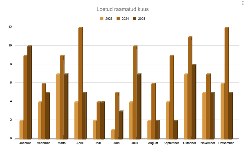 Allpool võib näha ka igakuist võrdlevat graafikut 3 viimase aasta kohta. Kuna 2024. aastal ma lugesingi hästi palju, siis on need numbrid teistega võrreldes muidugi peaaegu igas kuus suuremad.
