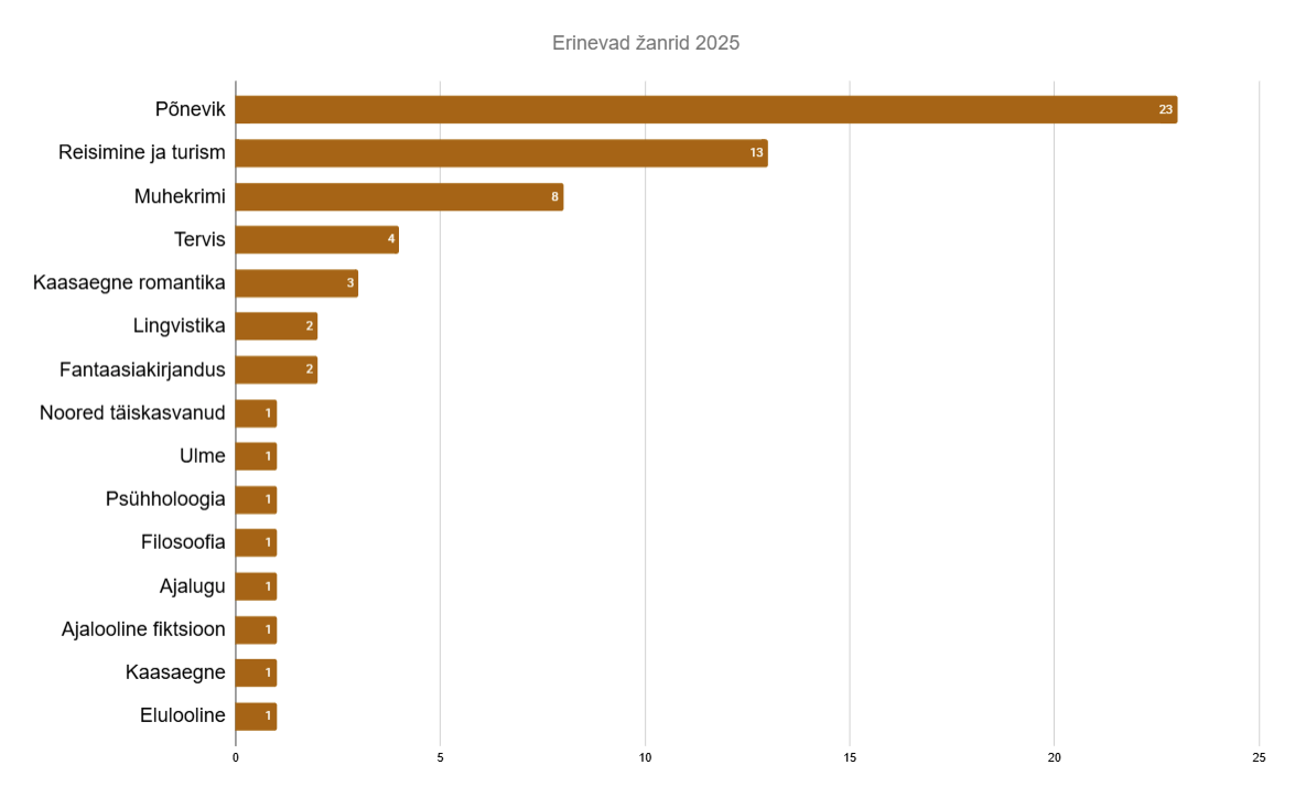 Erinevaid žanreid oli seekord esindatud 15. Üldse mitte originaalselt olid kõige populaarsemad jälle põnevikud (23). Suuresti tänu Minu sarjale jõudis auväärsele teisele kohale reisimine ja turism (13), lugesin ka päris mitut muhekrimi (8) ja lausa täitsa mitut terviseteemalist teost (4). Kuna Neitsijõe viimased osad jäid ka 2025. aastasse, siis jõudis tabelisse kaasaegne romantika (3). Kätte sattus isegi paar raamatut lingvistika teemal (2) ja uue žanrina tegi debüüdi fantaasiakirjandus (2). Ühe raamatuga olid esindatud noorte täiskasvanute romaanid, ulme, psühholoogia, filosoofia, ajalugu, ajalooline fiktioon, kaasaegne pereromaan ja elulooline raamat.