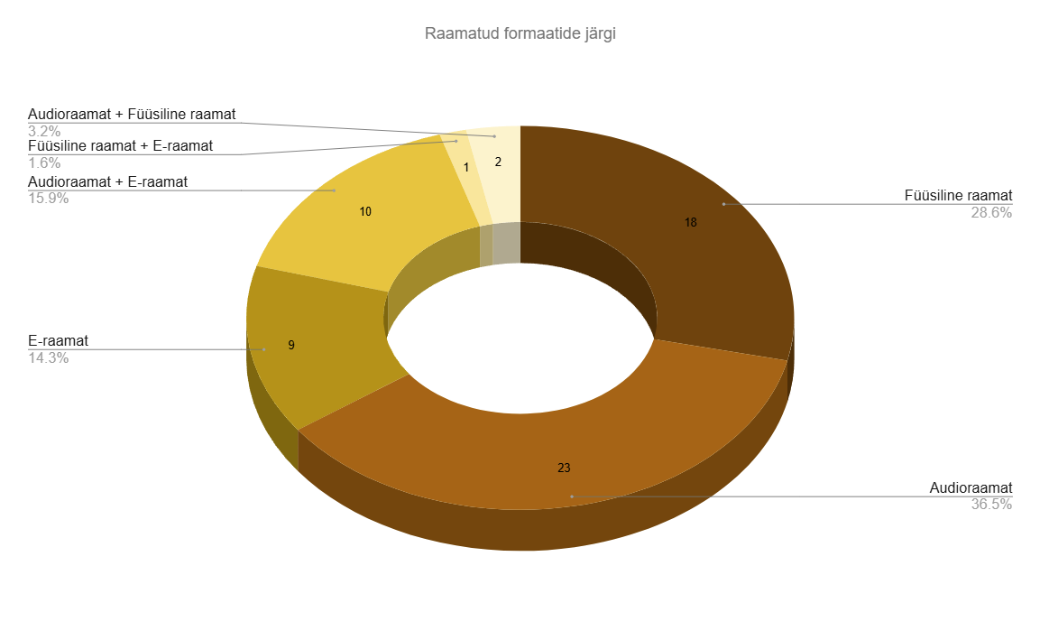 Lugesin raamatuid tihti mitme formaadi kombinatsioonis. Olen täitsa üllatunud, et kuigi oodatult kõige populaarsem formaat oli audioraamat (23), ei jäänud ka füüsiline raamat (18) üldse kaugele maha, võibolla oli asi selles, et mu raamaturiiul ei ole kummist ning olen üritanud rohkem lugeda neid teoseid, mis mul olemas on.