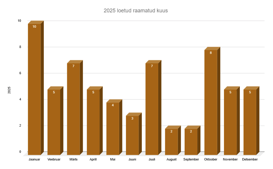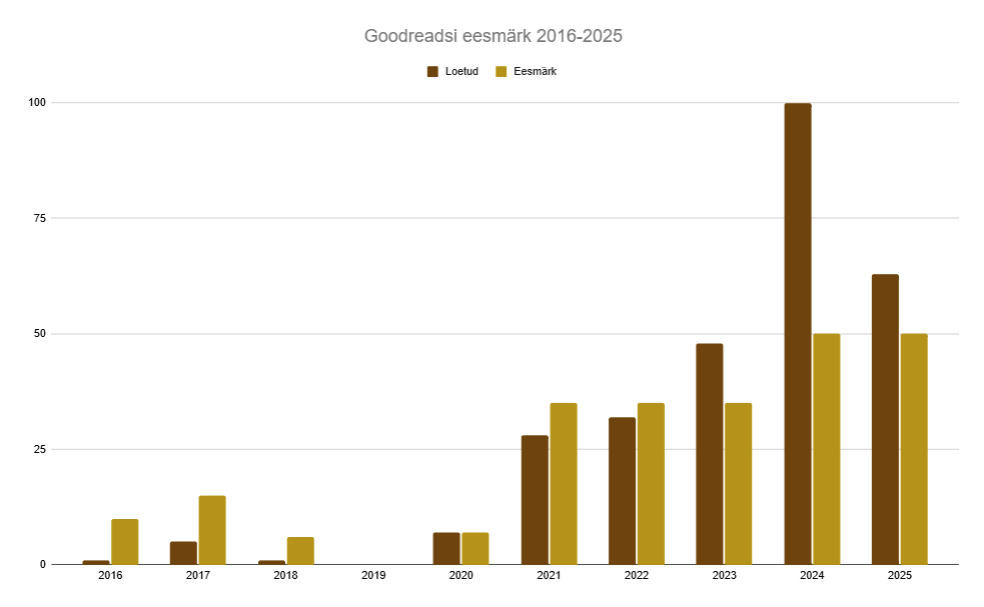 Sarnaselt 2024. aastaga seadsin 2025. aasta alguses Goodreadsis selliseks pehmeks eesmärgiks lugeda 50 raamatut ning õnneliku viiekümnenda raamatu lõpetasin oktoobris (võrdluseks: 2024. aastal juhtus see juulis).