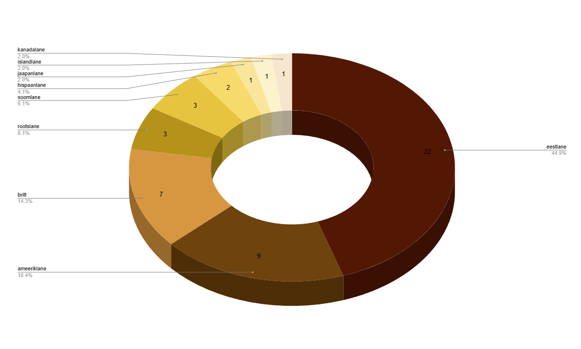 Erinevaid rahvusi autorite peale oli kokku 9, kõige rohkem oli eesti autoreid (22), järgnesid ameeriklased (9) ja britid (7).