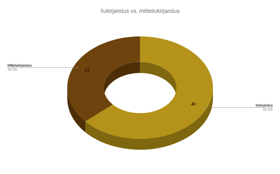 63-st loetud raamatust 40 ehk üle 63% olid ilukirjandus ja 23 ehk peaaegu 27% mitteilukirjandus.
