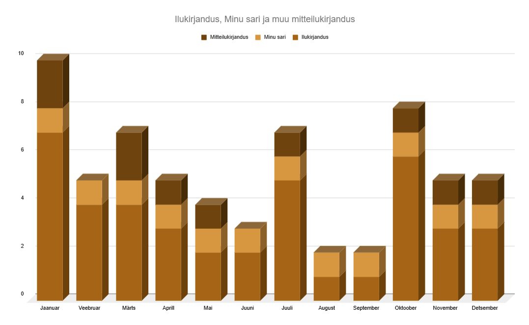 Kui nüüd allpoololevat diagrammi vaadata, siis tegelikult läks mul mitteilukirjandusega isegi üsna hästi. Minu sarja raamatu suutsin läbi lugeda tõesti igas kuus, mis jätab 23-st mitteilukirjanduse teosest alles 11 ja see on ju õige natuke vähem kui 1 raamat kuus. Graafiku pealt on näha, et oli kuid kui peale Minu sarja raamatu ma muud mitteilukirjandust kätte ei võtnud, aga oli ka selliseid kui lugesin ühe kuu jooksul mitu.